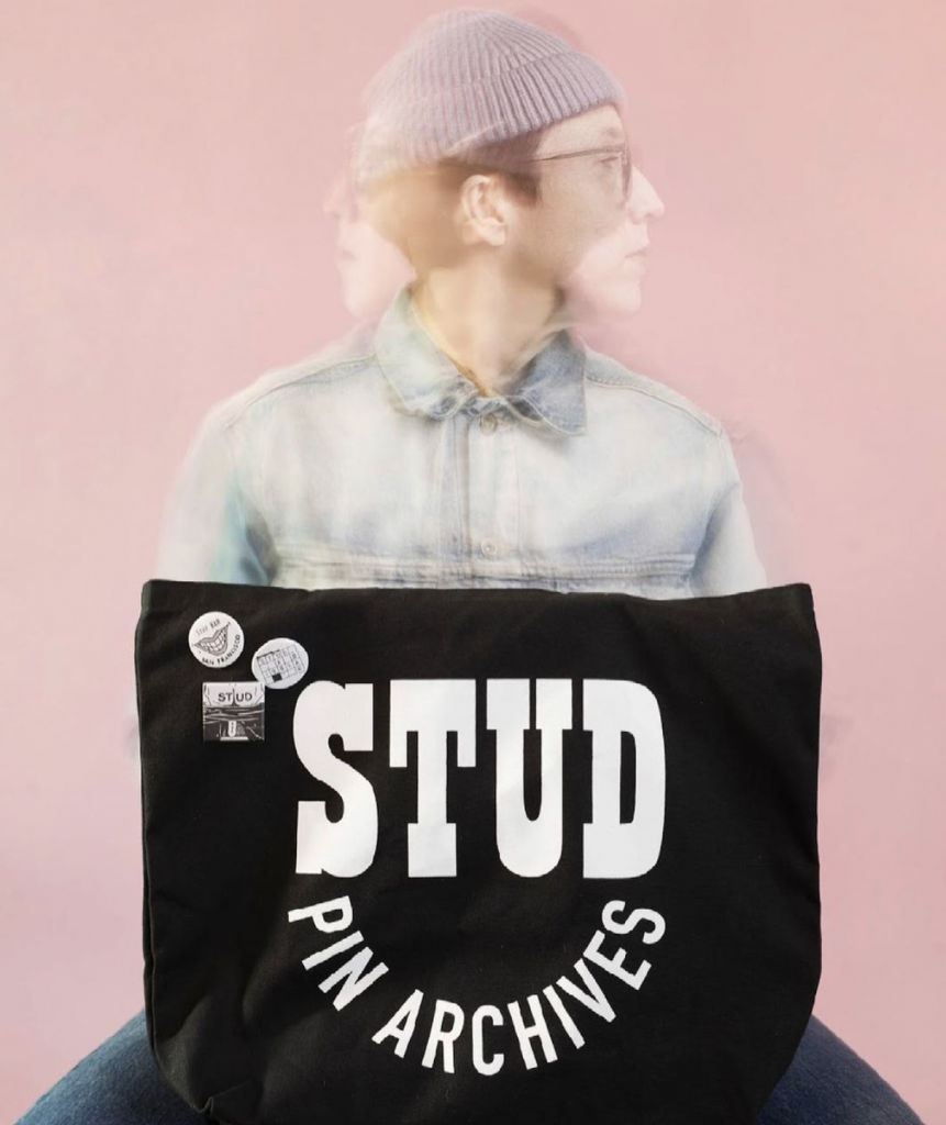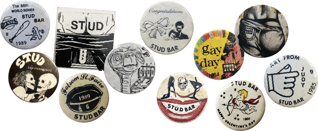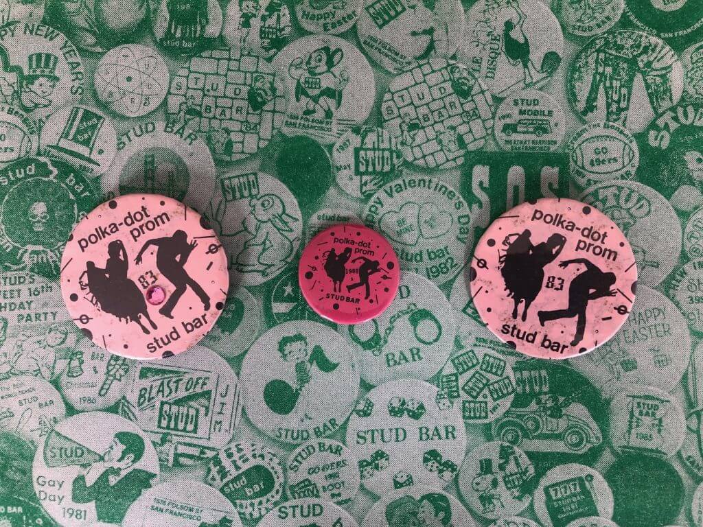 Stud bartender Paul "Gidget" Sinclair designed a collection of promotional pinbacks for the bar. These spanned from the late 70s until his untimely death due to the AIDS virus in the late 90s. These pinbacks are a visual commentary and response to pop culture, world events, and the vibrant local community of the Stud. The graphics celebrate the culture and events of the bar, especially holidays and annual parties like the Polka Dot Prom which gave many the prom they always wanted in high school but were not able to attend in the ways they wanted. Pins were collected, exchanged, made and lost, and are now being preserved as reminders of the community that created them.